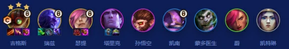 这套阵容的九人口成型成员为炸弹人、瑞兹、瑟提、宝石、猴子、凯南、蒙多、蔚、女警