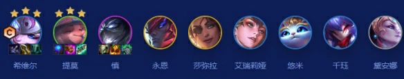 由希维尔、提莫、慎、永恩、莎弥拉、刀妹、悠米、千珏、黛安娜这九张卡构成