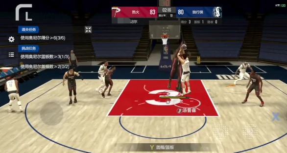 进攻端没什么特殊技巧,延续之前的背身强打策略就行,让奥尼尔在三秒区附近活动,重点留意准备上篮的对手。看到对手突破进三秒区要起跳上篮时,别犹豫,马上上前起跳,靠着身高和弹跳优势,能给对手一个结实的盖帽。就算盖不掉,只要成功干扰到对手投篮,也能算在任务进度里。记住别盲目冲出三秒区,一定要坚守内线。
