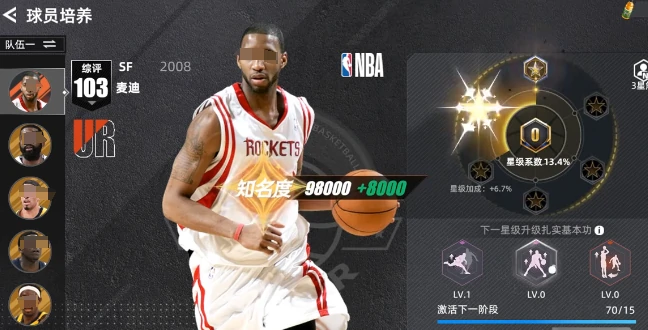 麦迪的养成核心围绕基础升级与星级突破两大板块展开。角色初始综合评分为103,玩家可以通过提升角色知名度来解锁下一养成阶段,同时激活扎实基本功强化模块。这个模块主要从运球、投篮、传球三个核心维度,全方位夯实麦迪的基础能力。当综合评分突破170、角色等级达到15级时,麦迪会迎来一波属性全面爆发:弹跳+10、强壮+10、远投+16、扣篮+14,这种攻防兼备的属性配置,能让他在赛场占据不小优势。