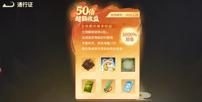 进阶付费配置方面,68元的高级通行证可解锁额外统帅栏位,提升阵容搭配的自由度,同时还附赠定制棋盘、强力异灵以及批量养成资源。这里要重点提一下600元档位,它恰好处于200-1000元返利区间的上限内,实际能获得等同于1200元价值的回馈,性价比非常突出。如果更侧重长期资源积累与卡册收集效率,推荐选择166元的组合包,里面包含68元高级通行证、68元至尊月卡以及30元超值月卡。月卡是日常资源的核心获取渠道,购入后会即时发放玉璧,还能每日领取刀币;双月卡叠加后,总计可获得130枚玉璧与80枚刀币。
