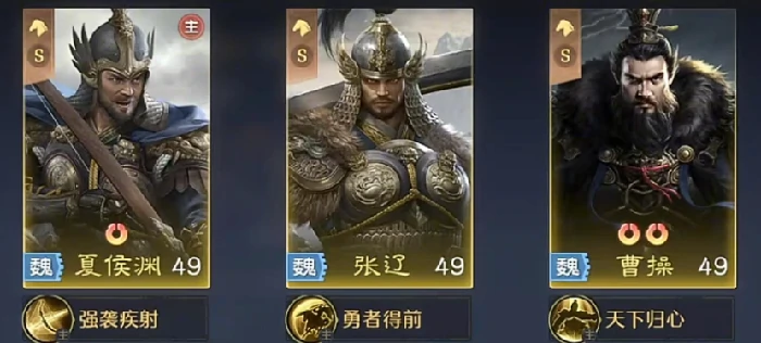 第三套是双骑夹击突袭流,阵容由张辽、夏侯渊与曹操组成,和第一套相比只是把徐晃换成了夏侯渊。夏侯渊与张辽同为骑兵武将,能触发双骑协同效果,战斗中可以分路输出,对敌方侧后排形成高强度打击;曹操依旧承担防护职责,他的减伤与治疗能为双骑输出争取足够时间。这套阵容的连击次数虽然不如第一套,但群体输出数值更高,针对敌方保守阵型时效果更明显,在竞技场中的适用性也更强。