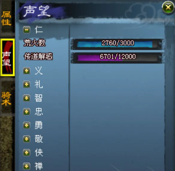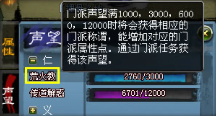 游戏里的声望划分成了不同条目,除了传道解惑,还有仁、义、礼、智等类别。每个声望条目都有对应的说明,比如玩家加入门派后,当门派声望达标,就能解锁专属门派称谓,同时还能获得对应门派属性的提升。