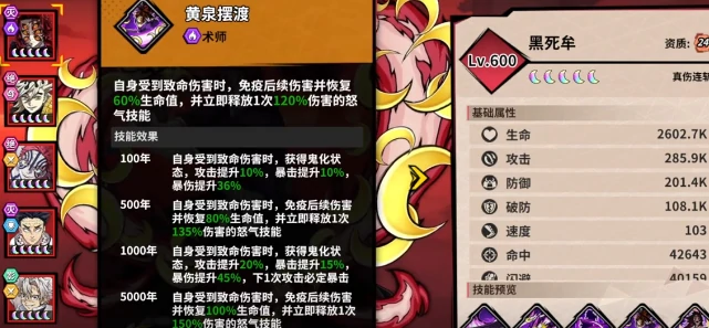 2602.7的生命值,直接打破了大家对法师脆皮的固有印象,面对闪避流阵容也能轻松穿透压制。更亮眼的是103的速度属性,能让他在大部分敌方输出出手前就叠好增益buff,做到真正意义上的又肉、又快、又能打。他的核心技能黄泉摆渡,堪称残血反杀的标杆技能——只要受到致命伤害,立刻触发锁血效果并回复60%生命值,同时直接释放120%倍率的怒气技能。相当于对面费劲把他打至残血,转头就被他的满额范围伤害轰脸。