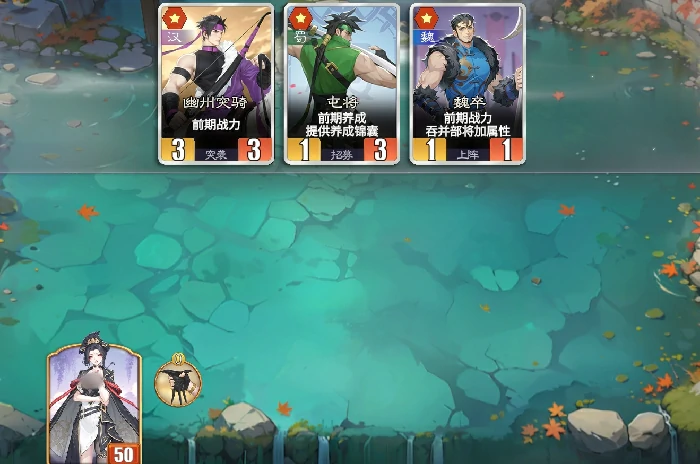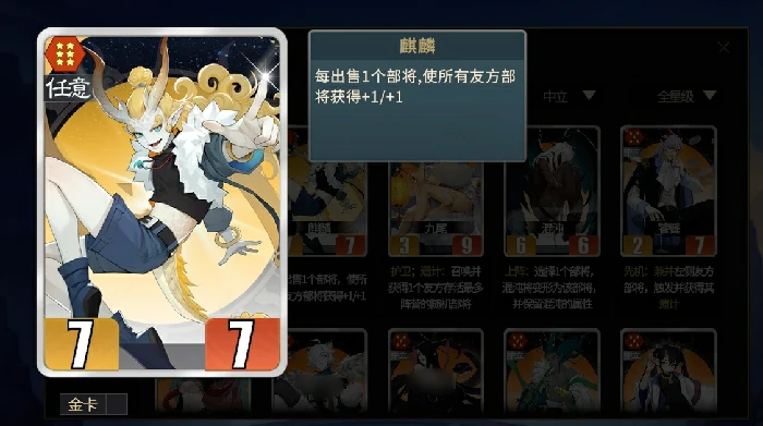 进入第六回合后,就可以把商店升到五本,开始搜找部将了。麒麟中立流的配套核心卡包括相柳(最多拿两张,不需要凑三连)、青龙、玄武、烛龙,这些都是五星部将,刷到就可以拿下,要是遇到心仪的卡但金币不足,直接锁定商店等下一回合再买就行。之后把买到的部将全部安排上阵,就不要再继续卖血了。
