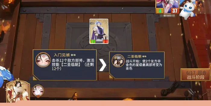 统帅武则天的机制效果有前置触发条件,需要在对战过程中累计击杀敌方12名部将,才能解锁她的被动能力。被动生效时,她会让战场上两名非金卡的友方部将直接升级为金卡,不用大家在商店里凑齐三张同名卡合成,既能节省大量金币,又能直接提升队伍战力,性价比拉满。而且这两名部将的选择并非随机,是按照星级从高到低排序,优先把星级最高的两名非金卡部将升级为金卡。