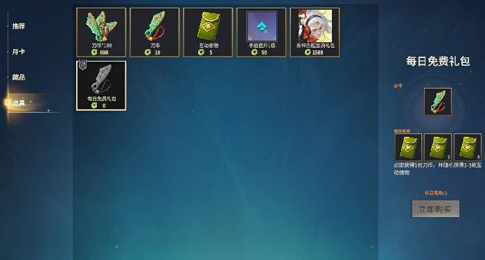月卡板块是购买月卡的专属入口,目前游戏内有两种月卡,定价分别为68元和30元。购买后除了能直接拿到一定数量的玉壁(付费货币)和刀币(收藏卡抽奖货币),每天还能领取固定数量的刀币作为日常福利。藏品板块售卖的是各类皮肤、特效和弈灵,需要使用玉壁购买。最后的道具板块,既可以用玉壁兑换刀币,还能购买互动信物、给通行证手册升级,以及各类直购礼包;此外板块内还有免费福利可领,每天会重置领取次数,记得按时去拿。