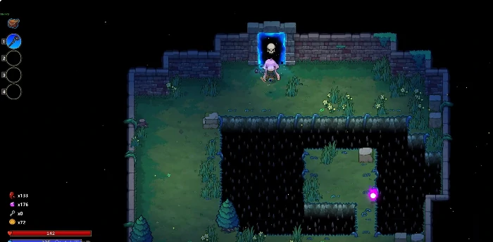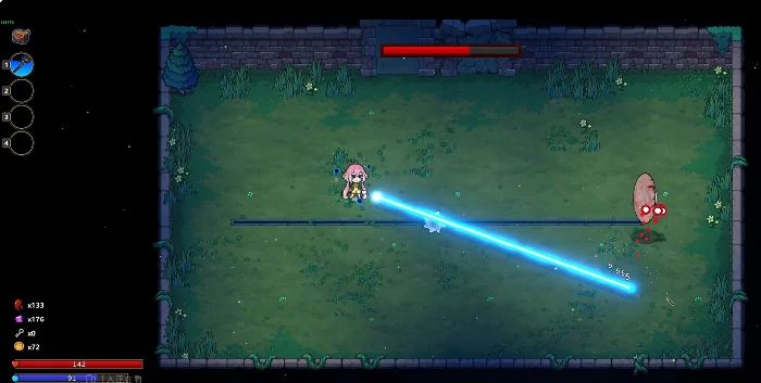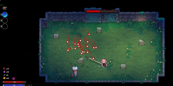 第五个是Boss无序残骸,血量高达1700,有三种攻击方式:第一种是快速向我们滚动而来,撞墙后还会喷出弹幕,这种只能靠走位躲避;第二种是跳起来在空中旋转后向我们滚动,撞墙后会喷出大量弹幕,依旧通过走位规避;第三种和第二种类似,只是滚动过程中会加速,我们还是依靠走位来躲开伤害。这个Boss其实很容易达成无伤,虽然弹幕多,但伤害不高,我们可以躲在右下角或者两个方框区域内,靠走位就能避开大部分攻击。