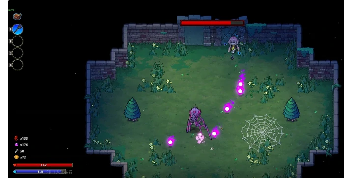第一个要面对的精英怪是巨蛛,它的生命值为650,共有三种攻击方式:第一种是从两个角度向外扩散着射出8发弹幕,不过弹幕中间存在空隙,我们只要站得远一些就能轻松躲开;第二种是射出一整排弹幕,依旧可以通过走位和把控距离来躲避;第三种是蓄力吐出蛛网球,被击中会掉血,蛛网球落地后会形成蛛网,踩上去就会被减速,这就需要我们提前预判蛛网球的落点,及时避开就行。巨蛛整体难度不高,血量也偏低,我们可以通过走位把它堵在角落里集火击败。