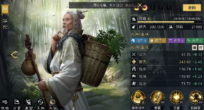 针对华佗的定位,我们也需要搭配合适的兵法来最大化他的辅助能力:奋鼓与乐善这两个兵法是首选,它们能有效提升华佗的治疗量与可治疗的队友数量;而惜兵爱民与活力技能,则能进一步增强华佗自身的生存稳定性,让他在战场后方持续为队友保驾护航。一套强力阵容从来都不是输出武将的独角戏,像华佗这样的核心辅助是保障队伍续航、维持战力均衡的关键,只有输出与辅助相辅相成,才能在长期战斗中持续压制对手。