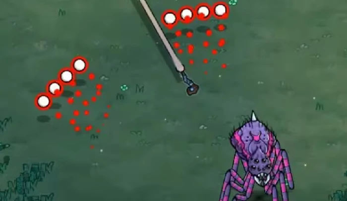 巨蛛还会释放另一组弹幕——5枚弹幕合并成一排后向外扩散。这种情况下,持续通过走位和巨蛛维持安全距离就成了关键,只要距离把控到位,就能轻松避开这轮攻击。一旦你成功闪躲,巨蛛的这次进攻也就宣告落空了。