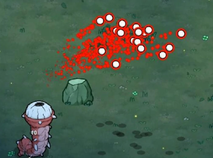 它的第二个攻击招式有明显的音效预警:当游荡蠕虫静止下来时,玩家会听到它腹部传出咕噜咕噜的声响,这是攻击前的信号,紧接着它会喷射出大量弹幕。只要留意到这个音效预警,玩家立刻拉开与它的距离,就能轻松规避这次弹幕攻击。
