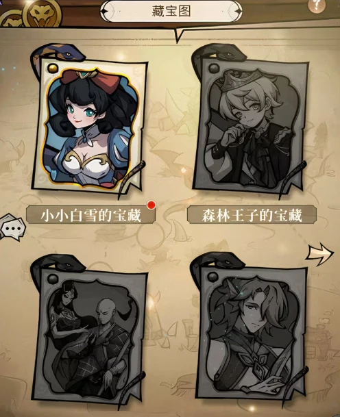 第二个要介绍的是藏宝图玩法,这类藏宝图由蛇灵发放,相当于游戏里的特色关卡玩法。通关藏宝图的每个地图就能解锁对应奖励,每张藏宝图会给出四个线索,每个线索下包含10个据点,战胜这些据点就能获取通关奖励。完成四个线索的挑战后,还能用钻石购买对应藏宝图的首领挑战权限,不过每天只能购买一次