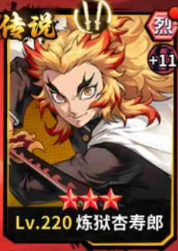 第三个推荐的是炎柱,也就是炼狱杏寿郎,他是灼烧队的常客。虽然只是SSR品质,但在灼烧队里作为队长,挂火能力是核心关键。开局前三个回合,他有多层挂火效果,还有60%概率给敌方附加更多debuff。炎柱的强度高度依赖流派搭配,单挂他一个的话发挥很有限,走灼烧流的话,必须保证阵容的持续输出能力才能把他的作用最大化。