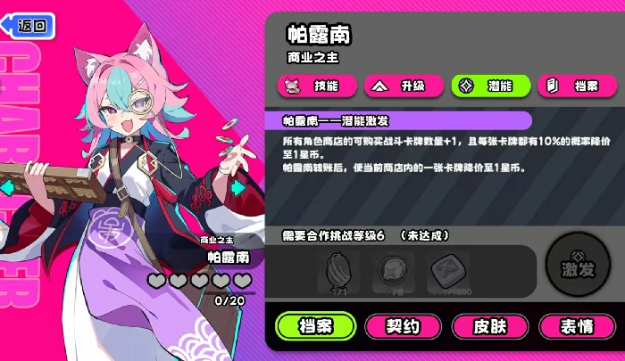 当帕露南完成潜能激活后,她的购物优势还能再上一个台阶:不仅商店里的战斗牌可购买数量再+1,每张卡牌还有概率直接降到1星币,运气爆棚时甚至能遇到全店卡牌都是1星币的情况,大幅降低她的购牌成本。另外在合作模式中,如果帕露南在商店内向队友发起转账,当前打开的商店里会立刻有一张手牌降到1星币。所以激活潜能后的帕露南,建议先转账再购物,能拿到更多实惠。