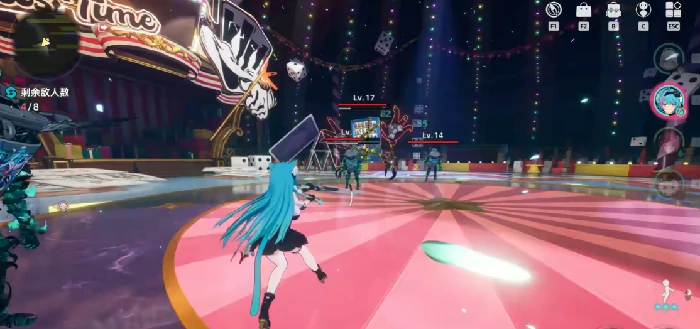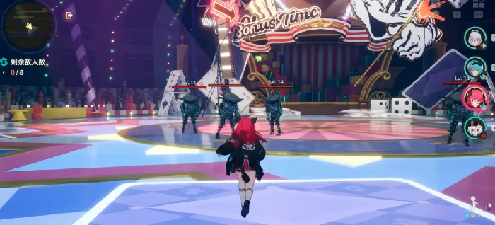 饮料机怪必须优先处理,因为它的正面攻击伤害极高,被打中一下基本就要掉半管血。挑战时尽量绕到它的背后输出,正面硬刚肯定吃亏。使用角色的连携技能可以破除它的防御状态,破防后就能打出正常伤害了。
