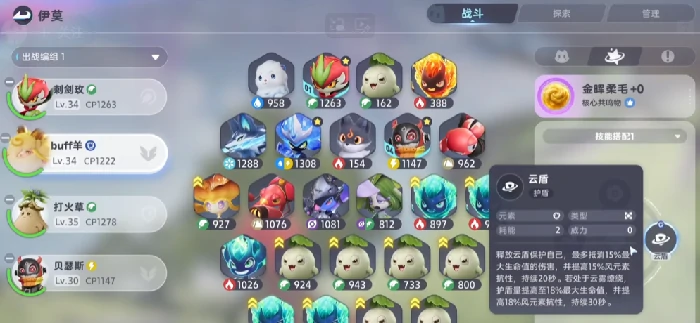 和蓬蓬羊搭配的第二个宠物,推荐走调草,它在游戏前期很容易获取,控制与减伤效果能为蓬蓬羊提供良好的输出环境。走调草的被动特性是每15秒就能给敌人施加虚弱状态,处于该状态的敌人对我方造成的伤害会降低15%,如果我方队伍有较高防御属性,这个减伤比例还能进一步提升,而且这个效果可持续20秒,能有效降低我方承受的伤害。