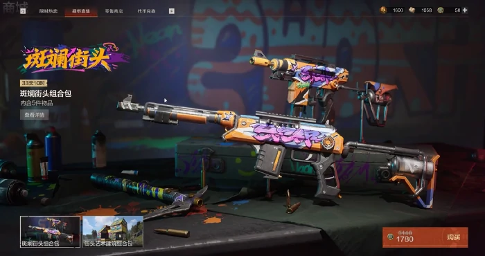 最后是需要充值货币的零售商店和捆绑直售区。零售商店里可以购买ak47浅灰沙滩皮肤,还有废料剑、大砍刀、匕首这些武器皮肤,另外改名卡也在这里上架,大家可以按需选购。捆绑直售区则是以斑斓街头为主题,除了冲锋枪、半自动步枪的系列皮肤外,还有街头艺术建筑组合,这些物品都需要单独购买,而且不属于通行证奖励范畴,要注意区分。