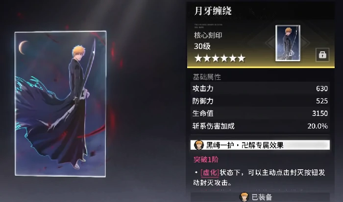 先来说套组刻印的三个槽位。第一个槽位是黑月之升-霸,它的主属性是随机生成的,优先刷出斩系伤害加成属性,毕竟卍解一护的输出核心就是斩系伤害,这个加成能直接作用在技能倍率上。第二个槽位黑月之升-灭,建议选暴击率属性。可能有人会觉得暴击伤害更直接,但卍解一护有个特殊被动:当暴击率超过100%后,每额外多出1%暴击率,就会自动转换成1.5%暴击伤害。所以对他来说,堆暴击率的收益更高,属性不会被浪费。第三个槽位黑月之升-护,主属性优先挑选必杀技充能效率,卍解一护的输出循环高度依赖必杀技,充能速度越快,就能更频繁地释放大招,输出节奏才会更流畅。