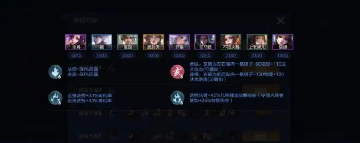 天赋搭配方面,起舞是必选的核心天赋——这个天赋能让火舞和婉儿每击杀一个敌人,就永久获得20点法术攻击,完美契合玄雍体系长期作战、属性层层叠加的特点;扩军天赋(能增加1个上阵名额)可以用来补入宫本武藏,激活三扶桑羁绊,进一步提升前排的承伤韧性;剩下的天赋可以选嗜血之影或者混乱之术,分别用来强化续航能力和控场效果,根据对局的实际情况灵活调整就行。