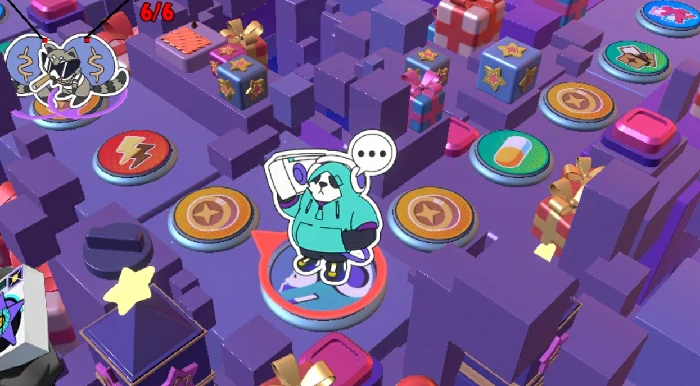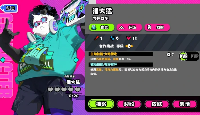 潘大猛的主动技能无需消耗行动点,发动后可直接获得两张指定手牌。这个机制在不同模式下差异显著:在合作模式中,他固定拿到巧克力蛋糕与汉堡两类回复型手牌;同时被动效果同步更新——只要使用其中任意一张,就会以自身位置为中心,为范围内所有友方角色恢复2点生命值,该效果无触发次数限制,且响应即时。而在标准模式中,主动技能产出则变为自爆与以牙还牙两张功能型手牌:自爆使用时自身会受到3点伤害,同时对周围所有敌人强制扣除5点生命值;以牙还牙则可将对手施加在潘大猛身上的效果类手牌完全反弹,形成强力反制。