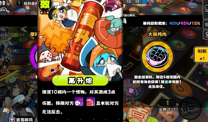 除了BOSS以外,地图上固定刷新两类常规怪物:氛围机器人和爆竹呱呱。氛围机器人每回合必定会释放炒热气氛,对周围4格范围内的所有敌方单位(包括自身)分别提升1点攻击力和1点防御力,属性增益可以叠加,如果拖延处理,会让敌方战力出现指数级增长。爆竹呱呱没有反击能力,而且和玩家发生碰撞时处于无敌状态;它唯一的主动行为,是对范围内血量最高的玩家造成和自身攻击力数值相同的真实伤害。被击杀后一定会掉落关键卡牌高升炮——这张卡可以指定10格范围内的任意目标,造成3点固定伤害同时清除目标身上的所有增益效果,是整张地图里战略价值最高的输出道具。