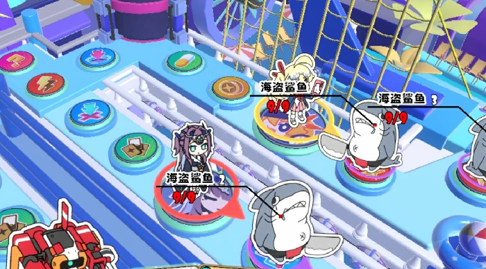 从第3回合开始,海盗王嘎呜会正式登场,它会停在固定格子上,处于睡眠状态但自带反击能力,这个阶段不用主动去挑战它。建议继续推进清怪进度,同时利用空闲回合踩格升级,尽快凑齐三星角色配置。到第5回合时,两名海盗精锐会同时出现,它们有个核心机制:每3回合就会在自身后方召唤一只海盗鲨鱼。所以一定要在它们首次召唤鲨鱼前就将其全部消灭;要是没及时击杀,就得特别注意站位——别停在海盗精锐的正前方,防止被它和新召唤的鲨鱼前后夹击。
