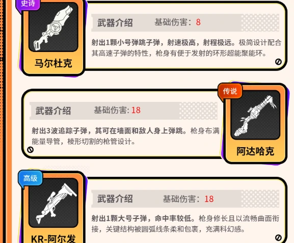 步枪家族品类丰富,每一款都有专属战斗风格。新手入门首推巨浪,它每次射击能打出三发子弹,命中率表现出色,基础伤害为12点。选它作为起步武器,新手能快速适应战斗节奏,轻松搞定初期的小怪。阿达哈克主打极致爆发,18点基础伤害的大口径子弹威力拉满,虽说命中率稍低,但输出爆发力十足,很对喜欢暴力输出玩家的胃口。要是偏好灵活走位配合持续输出,高级步枪阿尔法会是好选择,它能发射弹跳子弹,枪身带着装甲般的厚重感,力量感拉满。