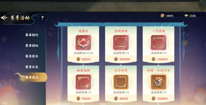 二次觉醒同样需要消耗10个觉醒石,完成后武将头像的“神”字标识会从白色升级为青色,通过这个颜色变化就能直观判断武将的觉醒阶段。觉醒石属于比较稀有的材料,而且100个碎片才能合成1个完整的觉醒石,靠碎片合成效率很低,更推荐大家通过这几个途径获取:第一个是赛季商店兑换,赛季持续45天,商店每15天刷新一次,觉醒石是稳定产出的兑换项,要是赛季内氪金超过100万,建议优先兑换觉醒石,之后再换其他武将强化资源;第二个是参与限时活动,这类活动里觉醒石的获取机会不少,但数量有上限;第三个是竞技场,每次提升排名或者获胜都能拿到觉醒石奖励,排名越高,胜利后获得的资源数量也会越多。