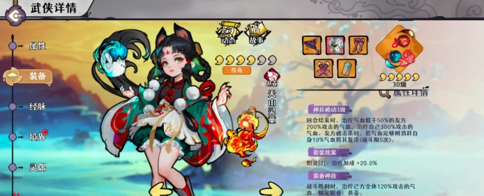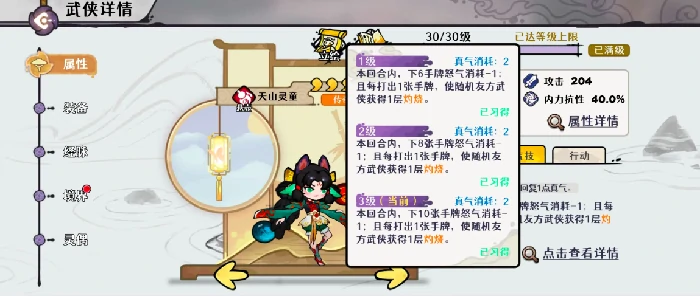 天山灵童的主动技能会随等级提升不断强化:1级时,本回合内接下来的6张手牌怒气消耗减1,而且每打出一张手牌,就会随机给己方一名武侠叠加一层灼烧;2级时,本回合后续8张手牌享受怒气消耗减1的效果;升到3级后,每回合后续10张手牌都能获得怒气消耗减1的加成。可见等级越高,能享受怒气减免的手牌数量越多,而减免幅度始终保持不变。至于装备选择,要根据角色的站位和团队定位来定:如果是打辅助位的灵童,可以选择炽灵套装搭配卧龙袍;如果走豪侠输出路线,普渡套装或饮血套装都是不错的选择。