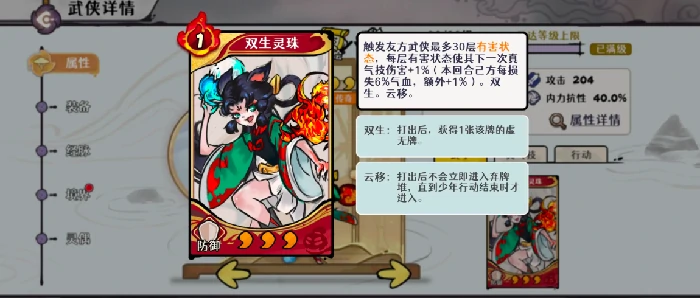 想要把天山灵童用得出神入化,得先吃透他的核心技能与属性机制,他在叠加增益方面有两大核心玩法。第一个玩法是借助灵童武学里的双生灵珠这张武学卡牌,玩家使用这张卡时,需要精准把控己方武侠身上的灼烧层数,最好让灼烧叠到最大值,而且自身血量损失越多,这个技能带来的收益就越可观——这也是自残流的核心逻辑。一般来说,当己方叠满5层灼烧,同时把血量控制在50%上下时,大概能获得50层左右的真气增伤buff。