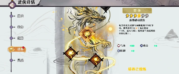 他的被动技能塑魂炼体效果也极具策略性:每当己方武侠气血降到55%以下时,就会为其叠加一层“灵”buff,每层提升15%伤害,最多可叠加10层,不过使用真气技能后会移除所有“灵”层数。基于这个机制,玩家可以衍生出两种主打打法:轻击消耗流和蓄力爆发流。