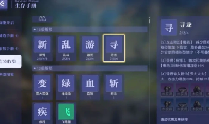 不少玩家在体验中发现,集齐寻龙套后,不仅能获得可观的伤害加成,还能解锁龙珠支线任务,进而开启龙珠收集玩法。生存手册中收录了多种套装,比如乱斗套、绿油油套等,这些套装的适配性与对应职业深度绑定,不同职业的玩家根据自身玩法定位,套装选择会存在明显差异。