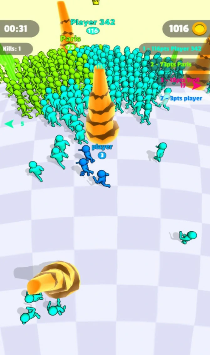 这款休闲竞技游戏得凭借操作才能取胜,开局你只能操控一个小角色,通过吞噬其他单位来不断扩充己方人数,壮大自身实力。拥挤世界里的实时排行榜可随时查看,能让你清楚掌握自己当前的排名阶段,全力冲击最终胜利。