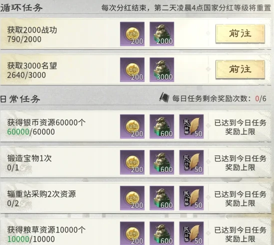 开荒首日,别漫无目的探索,核心目标是尽快解锁迷雾里的大叛军——战功越高,国家贡献值涨得越快,用贡献在商店兑换资源,还能大幅加快发育节奏。初期叛军难度不高,优先派星级高的武将出战,至少是绿色品质,这样能多一个追击格放技能。要是没打过叛军,记得补刀收尾;红将到手前,武将搭配不用太纠结,星级够就够用。得记住,国家贡献是发育的核心,日常任务一定要做满,操作简单不费时间,还能拿不少奖励。战功主要靠打城和对战获取,和贡献值直接挂钩。