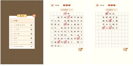 这款游戏深耕汉语言文化,没有走搞怪跟风的路线,所有文字素材均取自散文或诗词。游戏内置5种不同玩法,每种都能带来充满趣味的文字挑战。比如找错别字模式里,40多篇小作文中暗藏着常见的用字失误,需要玩家逐一纠正;诗词成语模式下,则要在常用成语与经典诗词里找出不妥之处。此外游戏设置了全球排行榜,玩家可以和各地的文化爱好者同台比拼,一较高下。