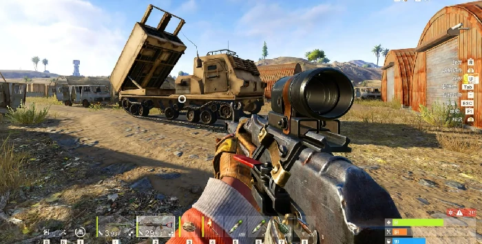 凑齐零件后,就可以去军事基地找发射器本体了。它一般固定在基地的开阔区域,竖起来的多管炮筒辨识度拉满,一眼就能找到。走近后会出现交互提示,这时把背包里的多管火箭弹和瞄准模块拿出来安装上去。安装时有几秒的读条时间,这段时间你没法移动,要是周围有敌人靠近就很危险,得提前留意环境。安装完成后发射器就会激活,屏幕上会弹出俯视视角的瞄准界面,能清晰看到大片区域的地形轮廓。