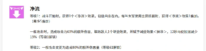 第四个技能净流是智河的核心机制技能,初始就能让她获得净流状态,队友使用主动技能时也能触发净流层数叠加——净流层数最多叠5层,每一层都能提供60%的额外伤害加成。另外,每当清除敌人1个增益效果,还会给敌人挂上抹净减益:12秒内敌人移速降低15%,配合后续的波涛汹涌技能能打出更稳定的输出。