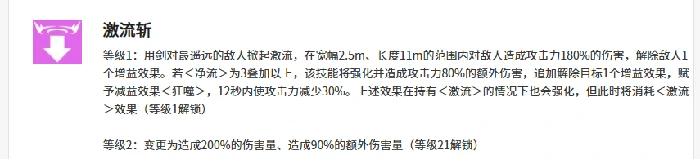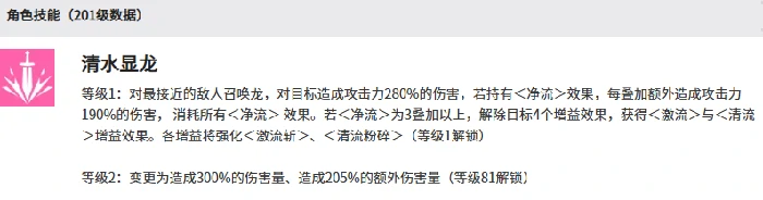 智河的核心特色之一,是能通过技能给敌人附加多种减益效果。她的第一个技能清水显龙属于召唤类技能,召唤出的龙会对敌人造成280%的伤害。如果此时智河自身带有净流效果,还能额外叠加190%的伤害——释放这个技能时会消耗掉身上所有净流层数,当净流层数达到3层及以上时,还能清除敌人身上最多4个增益效果。释放后智河自身会获得1层净流和激流增益,这两个增益都能为后续的激流斩提供强化;要是净流叠到5层再释放技能,后续能获得的净流叠加效率还会进一步提升。