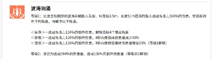 波涛汹涌技能依托之前召唤出的龙发动范围爆炸攻击,攻击范围内的所有敌人都会受到360%的伤害。如果敌人身上带有澄没、狂噬、抹净这些减益效果,还能触发120%的额外伤害,同时还能根据触发的减益类型,获得净化增益、降低伤害减免、提升最终伤害等不同的强化效果。要是让智河担任队长,还能激活幻流队长技能,进一步强化队伍的精灵体系战力。