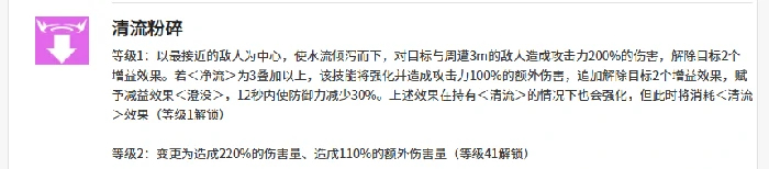 第三个技能清流粉碎是突进型技能,智河会快速冲向敌人,造成200%的攻击伤害,同时清除敌人2个增益效果。如果此时智河带有净流,还能触发100%的额外伤害,并且再次驱散敌人2个增益,同时给敌人挂上沉默减益:12秒内敌人的防御降低30%。