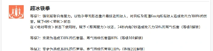 超冰铁拳是勒内白银的范围伤害技能,她会凝聚魔力灌注到手甲发起重击,能对自身周围6米范围内的所有敌人造成等同于攻击力300%的伤害,同时附带4秒的眩晕效果。若处于绝对零度状态下使用,还会触发酷寒魔力效果,在接下来的24秒里,每2秒就会对范围内敌人造成等同于自身攻击力60%的持续冰属性伤害。