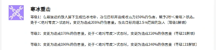 寒冰重击会根据勒内白银与敌人的距离生成一片结冰区域,只要区域内有敌人,就能直接将其冻结,同时对目标造成等同于自身攻击力150%的伤害,还附带2秒的眩晕效果。要是此时她处于绝对零度状态,寒冰重击的伤害占比会提升至200%,且伤害范围会覆盖自身周围2.5米内的所有敌人,随着角色等级提升,这个伤害百分比还能进一步增长。