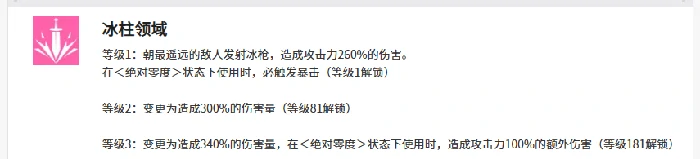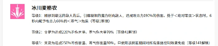 第三个技能是冰川麦格农,使用时勒内白银会锁定最远的敌人发起远距离魔力攻击,基础状态下能造成等同于自身攻击力190%的伤害;若处于绝对零度状态,还能额外获得基于自身攻击力60%的寒气伤害加成。当角色达到141级解锁该技能3级效果后,伤害占比会提升至250%,输出能力会有显著飞跃。
