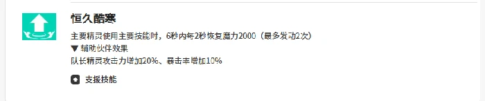 后期解锁精灵联动效果后,勒内白银的恒久酷寒技能能在6秒内为她恢复2000点魔力,这个效果最多可连续触发2次。要是让她担任队伍队长,还能为全队提供20%的攻击力加成与10%的暴击概率加成,进一步提升团队的冰系输出能力。