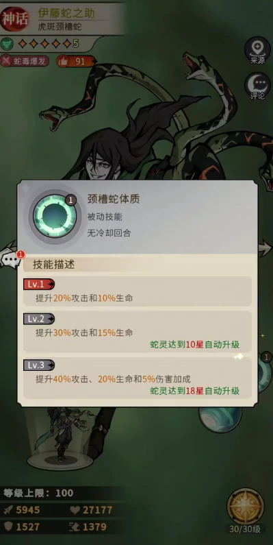 颈槽蛇体质是他自带的基础增益特性,角色上场即可触发。初始效果能提升自身20%攻击力和10%生命值;等技能升级到3级(角色达到18星解锁),增益效果会强化为提升40%攻击力、20%生命值,同时额外增加5%伤害加成。最后一个被动技能狩猎本能,玩法价值极高:每回合启动阶段,若场上有带蛇毒标记的敌方单位,伊藤蛇之助会立刻对该目标释放一次恶堕蛇手,释放后该效果进入3回合冷却;若场上没有带蛇毒标记的敌人,则会给敌方生命占比最低的单位施加一层蛇毒。战斗开局时,该技能还会直接给伊藤蛇之助提供10%攻击力的增益。