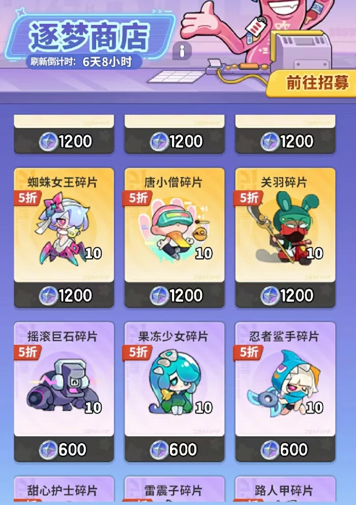 招募积分要在逐梦商店使用,可兑换传说、史诗、稀有品质的梦灵,不同品质的梦灵所需积分不同。比如传说梦灵前三次兑换能享5折优惠,1200积分就能换10个碎片,三次之后就恢复原价2400积分10碎片。如果想一次性凑齐一个传说梦灵,按原价算最少需要8400积分;但要是每周只换三次,等下周打折重置后再继续,总共只要6000积分就能凑齐。