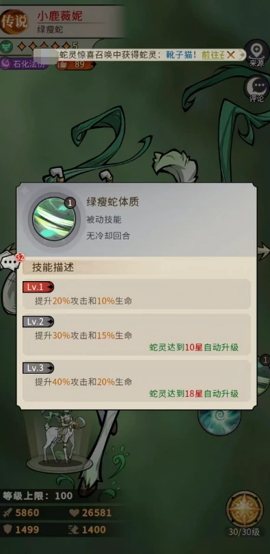 绿瘦蛇体质是小鹿薇妮的基础被动增益,初始能为她提升20%攻击与10%生命值。当小鹿薇妮升至18星后,该被动会自动升级,将属性加成提升至40%攻击与20%生命值,从前期就能为她提供不错的属性支撑。