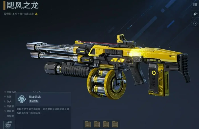 首先要给大家推荐的是飓风之龙。这把枪在塔防模式里战术适配性极强,但它的战力发挥特别依赖插件组合。主动技能能瞬间把能量条补满,还能触发四连发射击状态,大幅提升单位时间的火力密度;被动技能会自动切换成龙炎弹模式,子弹命中后会产生范围爆炸伤害,对付扎堆出现的敌方单位清场效率超高。要注意的是,如果插件搭配不当,这把武器的整体输出效率会大打折扣,建议搭配提升能量恢复或者强化范围伤害的插件,这样才能把它的威力发挥到最大。