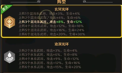 游戏里所有武将分为火、混沌、水、风四大属性,属性之间有着明确的克制关系:被克制的一方受到的伤害会增加25%,命中率提升20%。合理利用属性压制能明显提高战斗胜率;另外,当同属性武将上阵达到2名及以上时,就能激活对应属性的光环,上阵的同属性武将越多,光环的加成效果就越强。所以,围绕单一属性来搭建阵容,是高效提升战力的核心思路。